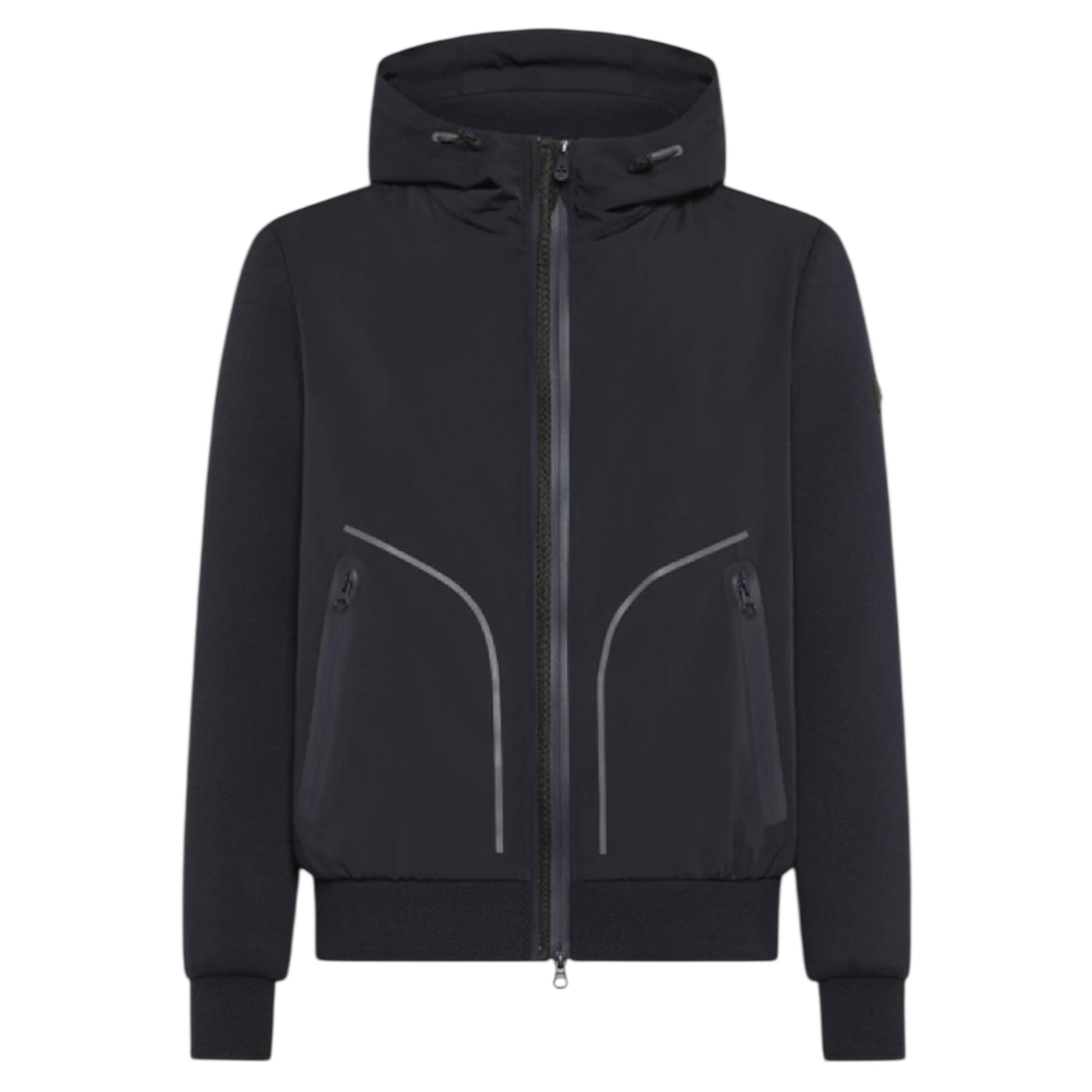 Capo hybrid dallo spirito urban e funzionale, pensato per bambini e ragazzi sempre in movimento. Corpo e maniche sono realizzate in scuba di poliestere elasticizzato con interno in maglina di viscosa, per una sensazione calda e confortevole. Il cappuccio e la parte frontale sono in nylon bi-stretch accoppiato a jersey di poliestere, per maggior resistenza e tenuta strutturale. Il design è completato da dettagli tecnici come il cappuccio fisso con tiranti regolabili, la zip a doppio cursore e le comode tasche laterali con profili catarinfrangenti a contorno. Un capo versatile, ideale per accompagnare bambini e ragazzi in ogni momento della giornata nei cambi di stagione.