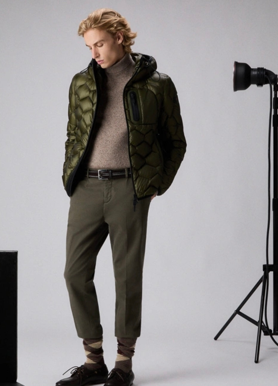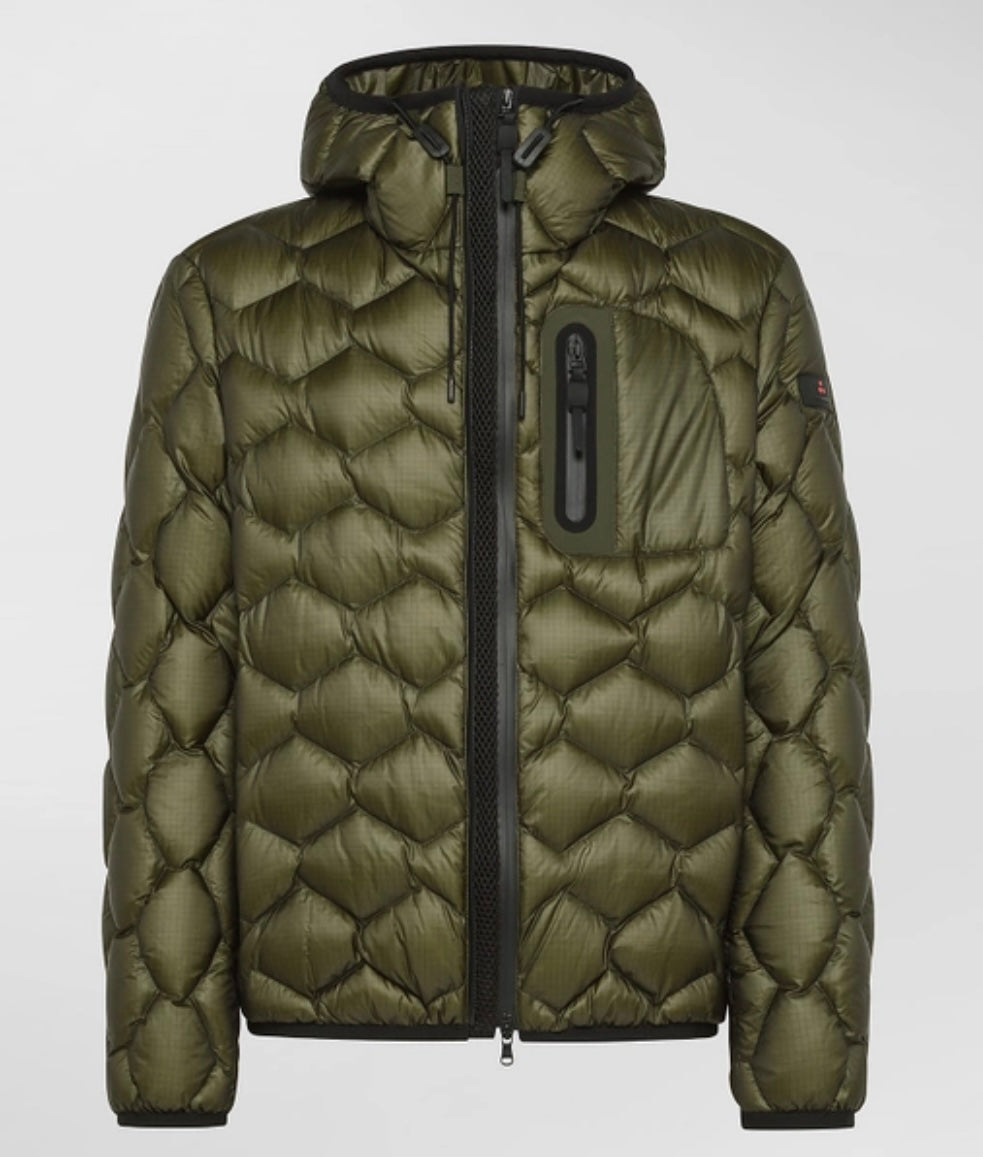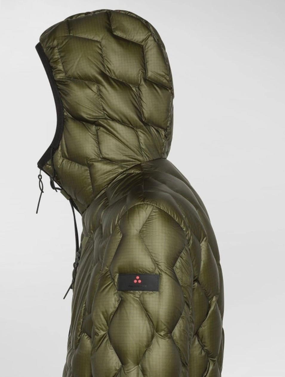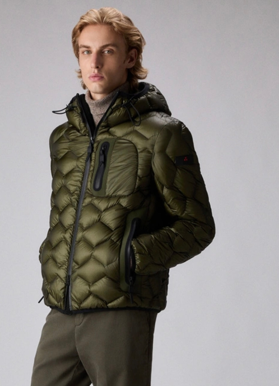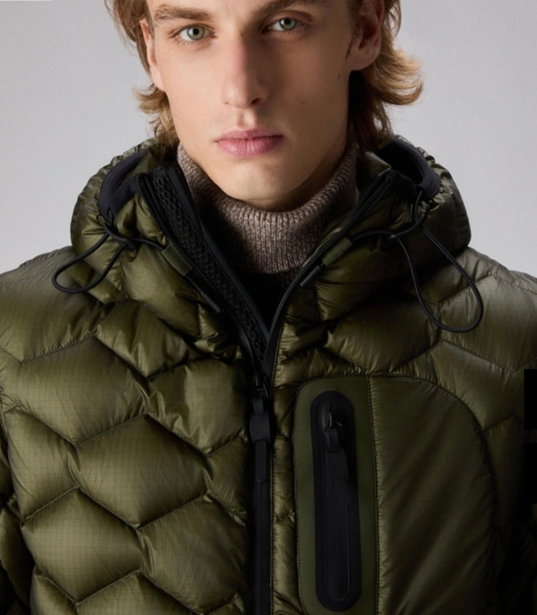 Piumino con trapunta a motivi geometrici composto principalmente da nylon ripstop 7den, un tessuto super fine ma particolarmente resistente agli strappi, dall’aspetto lucido e, secondariamente, da tela di nylon stretch multi bava accoppiata con un jersey di nylon soffice e caldo grazie alla finezza dei filati utilizzati. Tasche laterali a filetto con zip e tasca sul petto termosaldate per donare maggiore tecnicità al capo. Le zip termosaldate sono progettate per essere resistenti all’acqua e al vento, impedendo all’umidità e all’aria di penetrare attraverso la cerniera, proteggendo dal freddo e dagli agenti atmosferici. Full zip centrale a spirale spalmata rovesciata, tirazip sulle tasche e i dettagli sui polsini e sul cappuccio sono neri ed enfatizzano l’aspetto sportswear del capo. Imbottitura in piuma naturale certificata. Uno stile dinamico e contemporaneo perfetto per chi ama lo sport e la vita attiva.