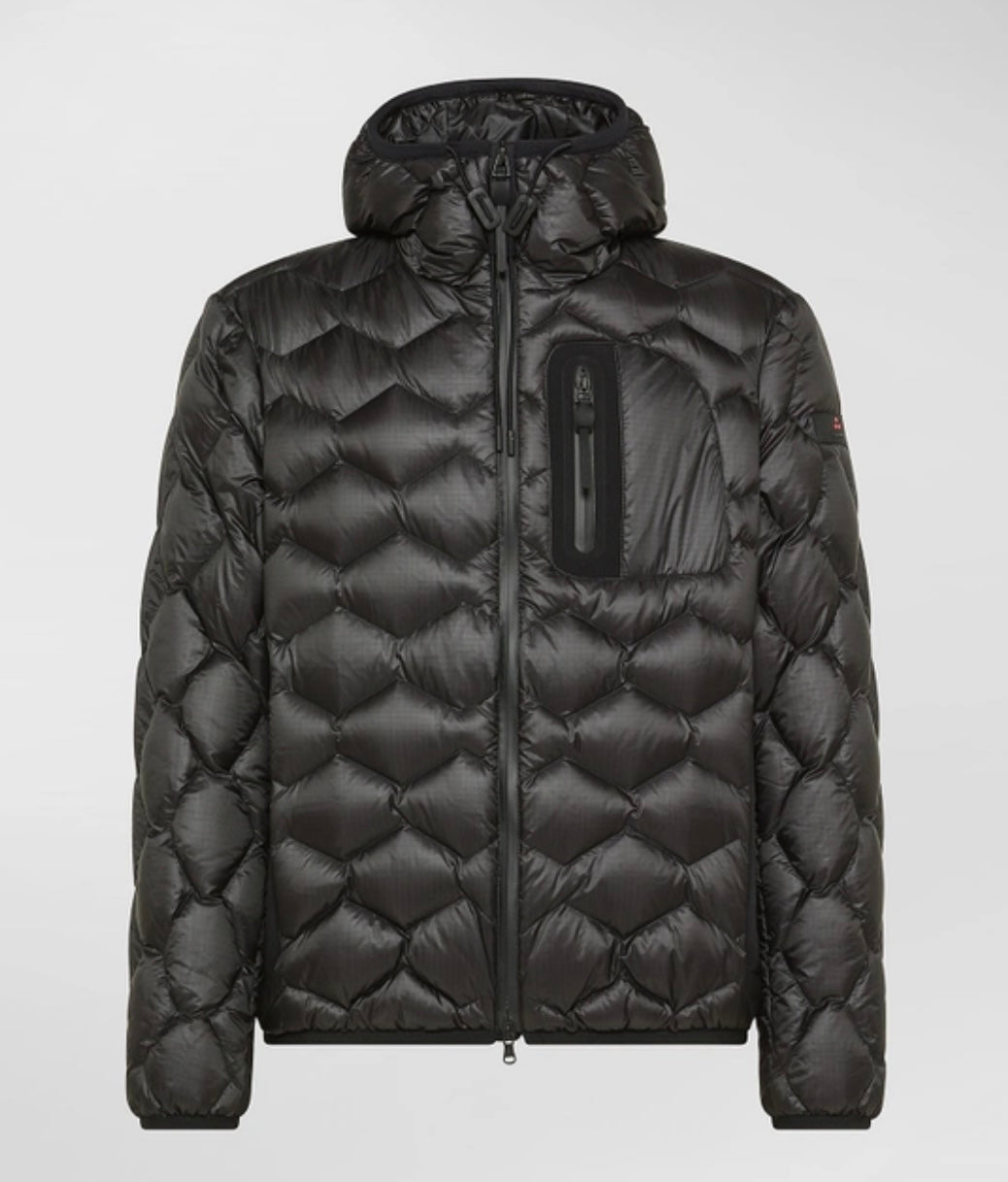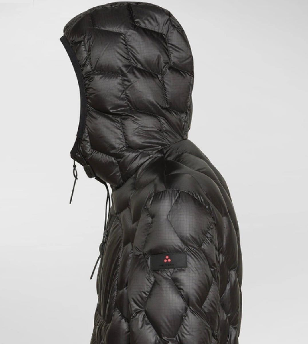 Piumino con trapunta a motivi geometrici composto principalmente da nylon ripstop 7den, un tessuto super fine ma particolarmente resistente agli strappi, dall’aspetto lucido e, secondariamente, da tela di nylon stretch multi bava accoppiata con un jersey di nylon soffice e caldo grazie alla finezza dei filati utilizzati. Tasche laterali a filetto con zip e tasca sul petto termosaldate per donare maggiore tecnicità al capo. Le zip termosaldate sono progettate per essere resistenti all’acqua e al vento, impedendo all’umidità e all’aria di penetrare attraverso la cerniera, proteggendo dal freddo e dagli agenti atmosferici. Full zip centrale a spirale spalmata rovesciata, tirazip sulle tasche e i dettagli sui polsini e sul cappuccio sono neri ed enfatizzano l’aspetto sportswear del capo. Imbottitura in piuma naturale certificata. Uno stile dinamico e contemporaneo perfetto per chi ama lo sport e la vita attiva.