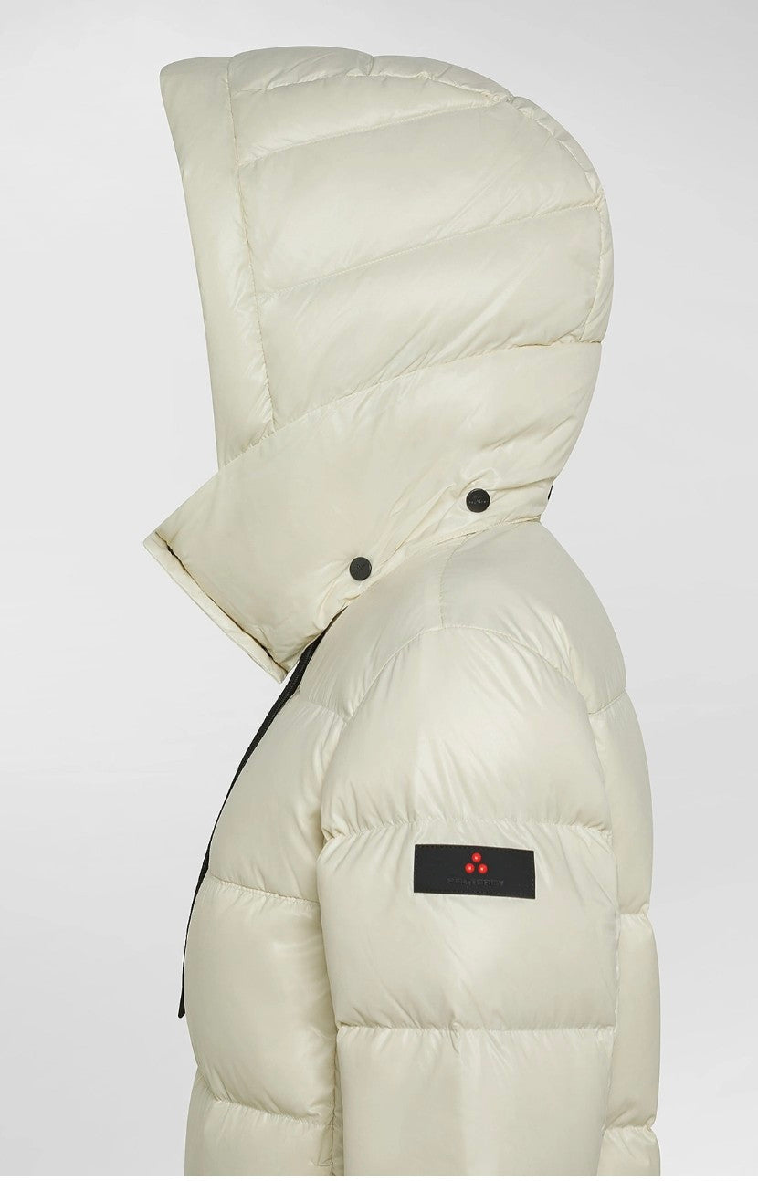 Puffer jacket ad ampie trapunte dal volume moderno, realizzato in nylon lucido dalla particolare morbidezza grazie a degli speciali trattamenti subiti. L’imbottitura diretta in piuma naturale certificata garantisce calore e leggerezza, mentre il doppio cappuccio – uno interno fisso e uno esterno removibile – offre massima protezione e adattabilità. Il collo alto con bottoni a pressione, la full zip centrale a doppio cursore a vista, in contrasto colore nero, e le ampie tasche laterali completano un capo pratico e distintivo, perfetto per uno stile urbano con attitudine outdoor. Il tessuto è trattato con finitura idrorepellente. Questo modello fa parte della collezione esclusiva firmata Peuterey in qualità di Official Fashion Partner di ACF Fiorentina per le stagioni calcistiche 2025–2028. Un progetto che unisce il DNA urbano e contemporaneo del brand alla passione e all’eccellenza delle squadre maschile e femminile della Fiorentina, con l’obiettivo di rappresentare al meglio identità, appartenenza e spirito di squadra — dentro e fuori dal campo
