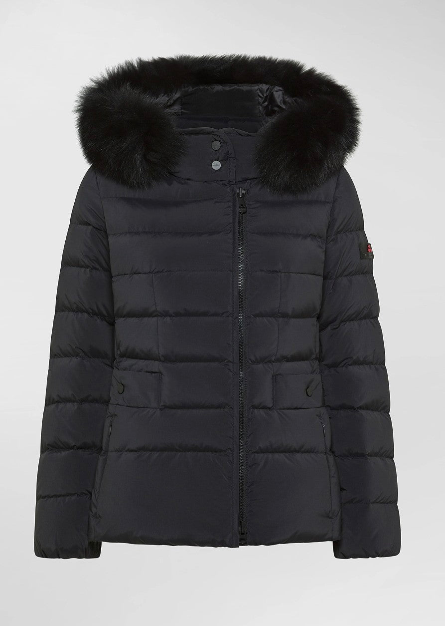 Piumino corto e soffice, realizzato in popeline leggero di nylon e microfibra di poliestere, lavorato ad alta temperatura per ottenere una mano sostenuta e un tatto polveroso, ulteriormente ammorbidito da un trattamento finale al silicone. L’imbottitura a canali in piuma naturale certificata assicura calore e leggerezza, mentre il cappuccio con bordo in pelliccia di volpe, removibile, aggiunge un tocco sofisticato. La zip centrale asimmetrica dona movimento alla shape essenziale e femminile del capo completata da collo con doppio bottone a pressione in tono e tasche laterali con chiusura a pressione nascosta. Water repellent, pensato per accompagnare i tuoi movimenti, garantendo massima protezione nelle giornate più fredde.