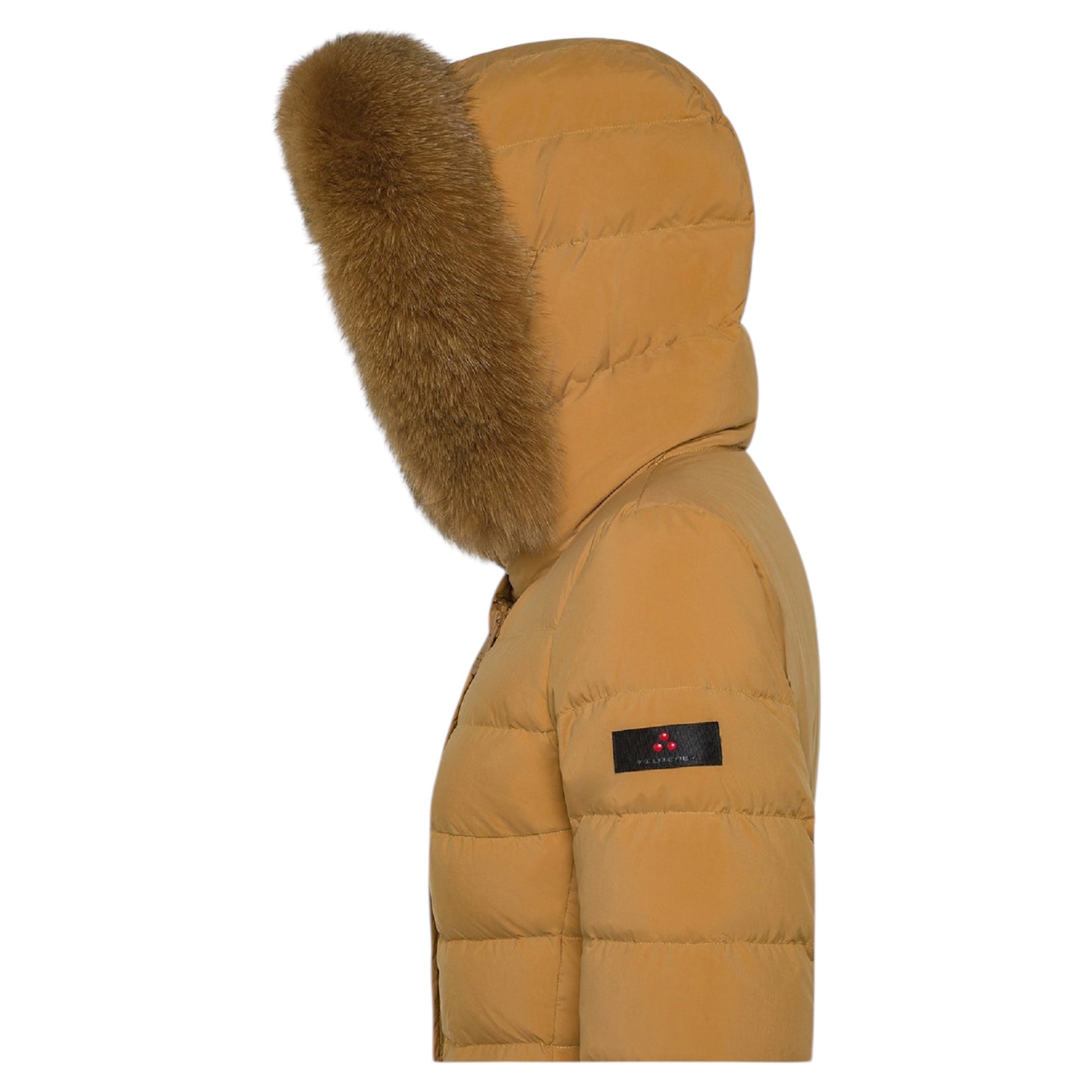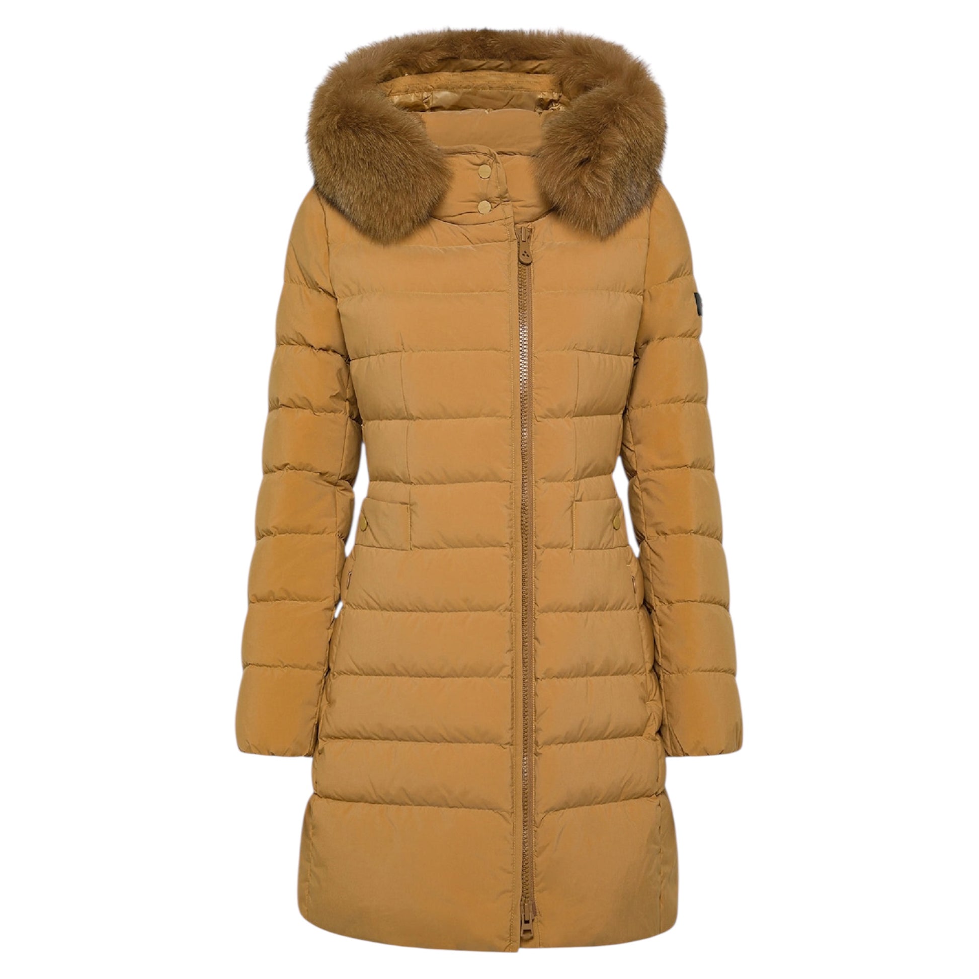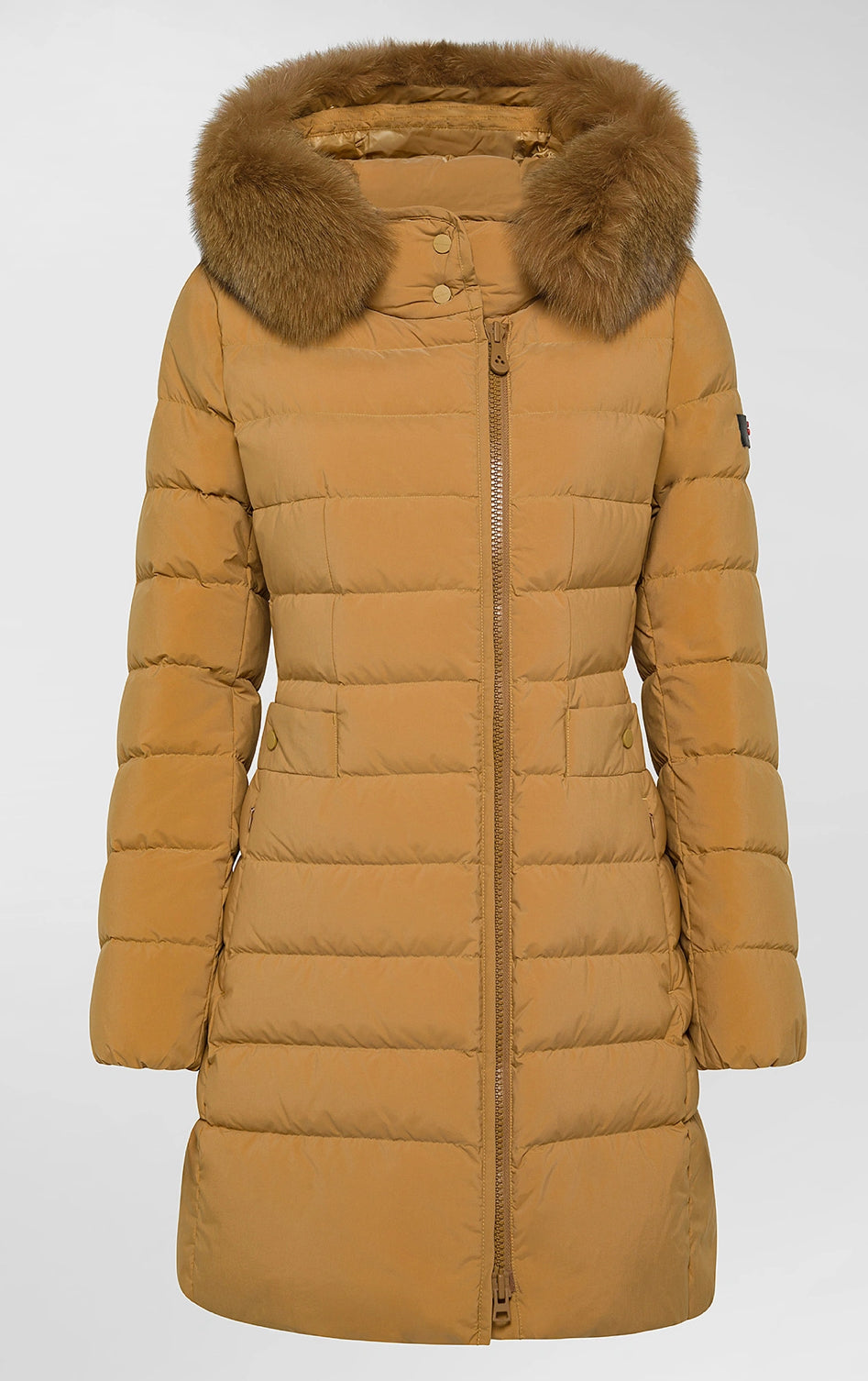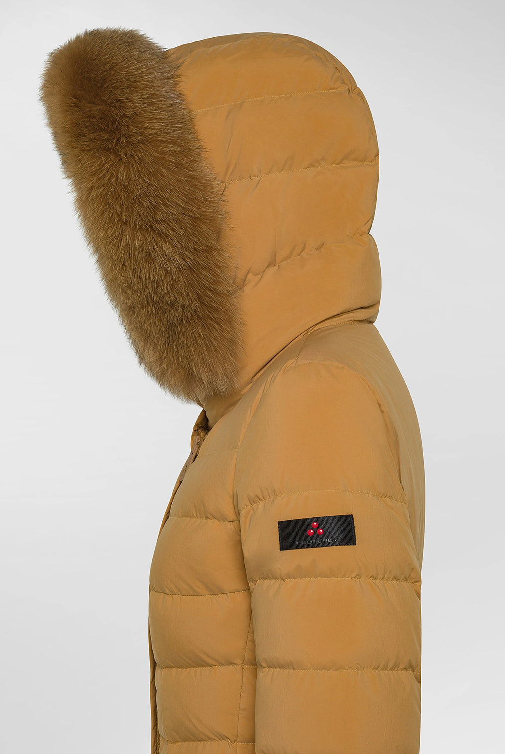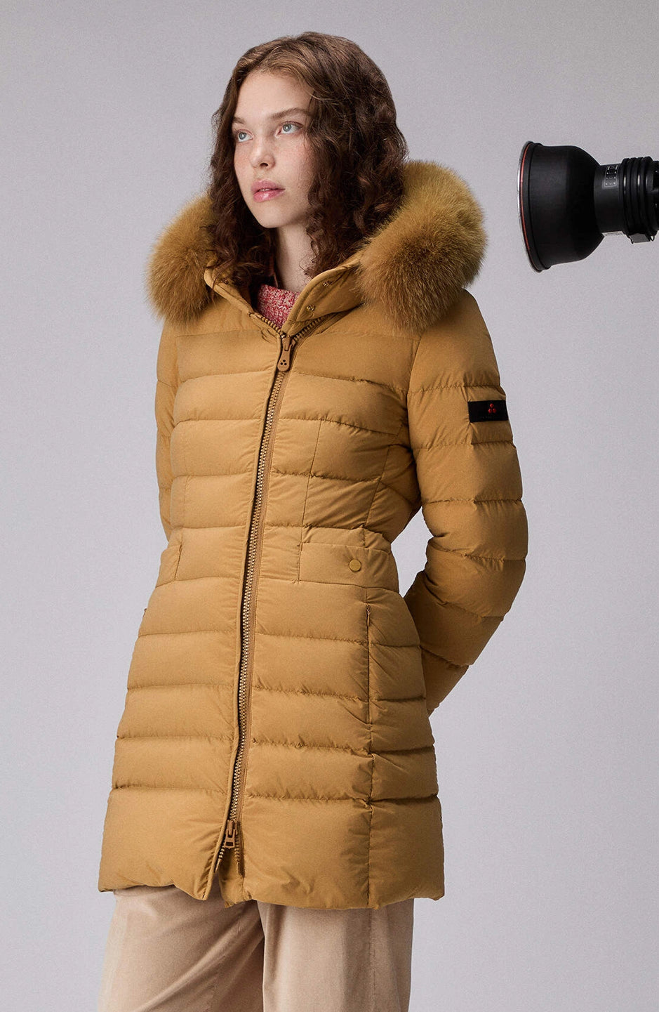 Piumino lungo trapuntato in leggero popeline di nylon e microfibra di poliestere, trattato ad alta temperatura per ottenere una mano sostenuta e un tatto polveroso, poi reso estremamente morbido grazie a un finissaggio al silicone. L’imbottitura in piuma naturale certificata assicura protezione termica con leggerezza, mentre il trattamento idrorepellente mantiene il comfort anche in caso di pioggia leggera. Il design è definito da una zip centrale a doppio cursore, collo avvolgente con bottoni a pressione tono su tono e cappuccio con bordo in pelliccia di volpe, removibile. Le tasche laterali con bottone a pressione completano un capo raffinato e funzionale, perfetto per l’inverno in città. Un modello iconico del brand, reinterpretato con dettagli moderni ed ancora più raffinati.