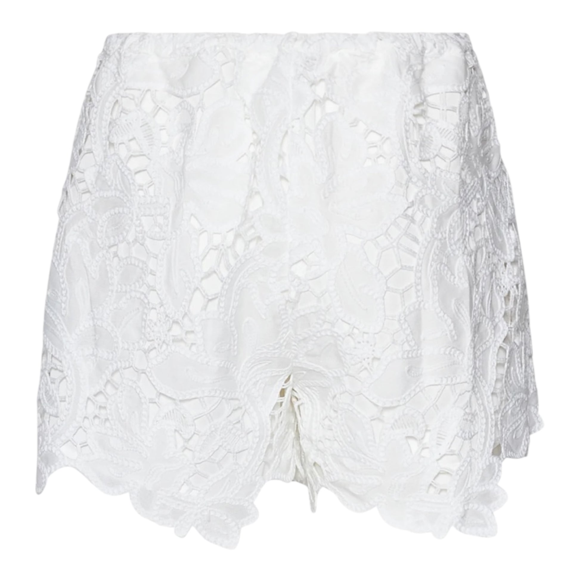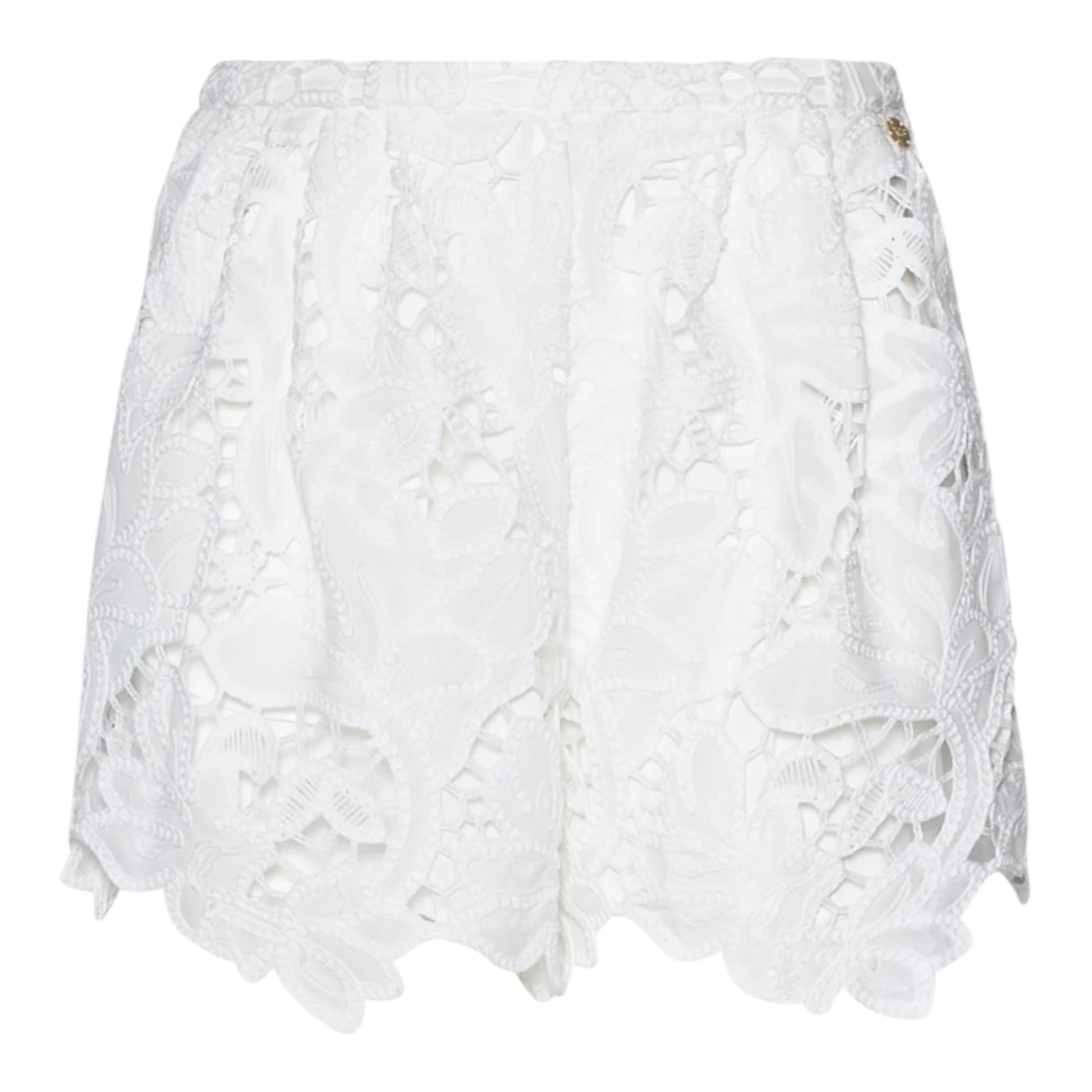 Questi shorts interpretano un’eleganza sofisticata e femminile, caratterizzata da una lavorazione decorativa ricca e da un bordo sagomato che definisce il design con raffinatezza. La composizione armoniosa e l’attenzione ai dettagli rendono il capo una proposta distintiva, ideale per uno stile luxury ricercato.