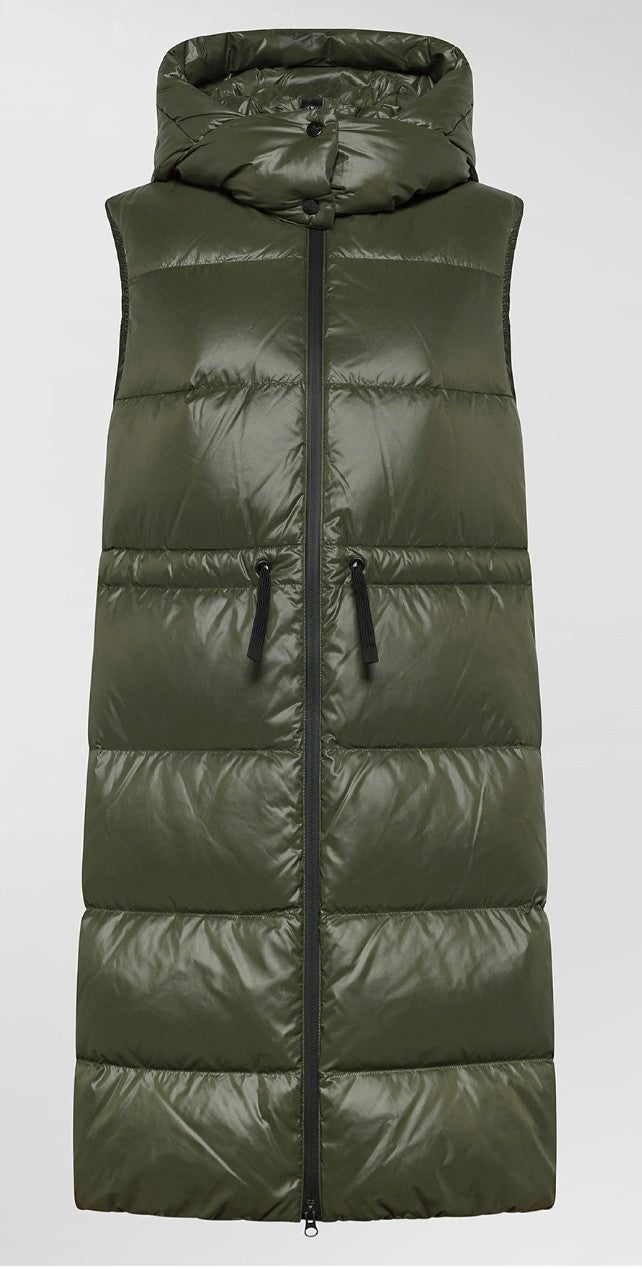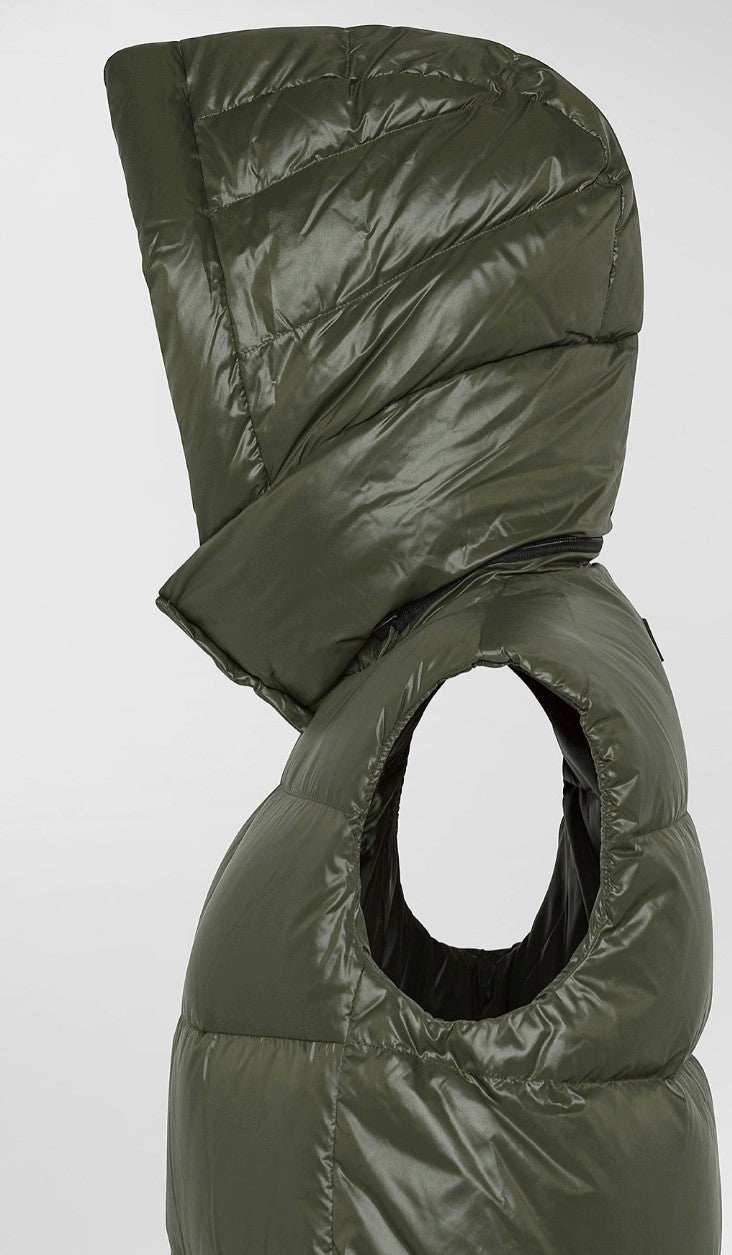 Gilet lungo e avvolgente ad ampie trapunte, realizzato in nylon dalla particolare lucentezza e dalla mano morbida, ottenuta grazie a speciali trattamenti di calandratura a caldo. L’imbottitura in piuma naturale assicura calore e comfort, mentre il tessuto windresistant e idrorepellente protegge dal meteo instabile. Il cappuccio ampio removibile con bottoni a pressione che garantisce una maggiore protezione, mentre la coulisse regolabile in vita valorizza la silhouette. Le zip e i lacci in contrasto nero aggiungono un accento grafico contemporaneo. Un capo versatile dal design distintivo perfetto per layering metropolitani e look quotidiani dal twist tecnico.
