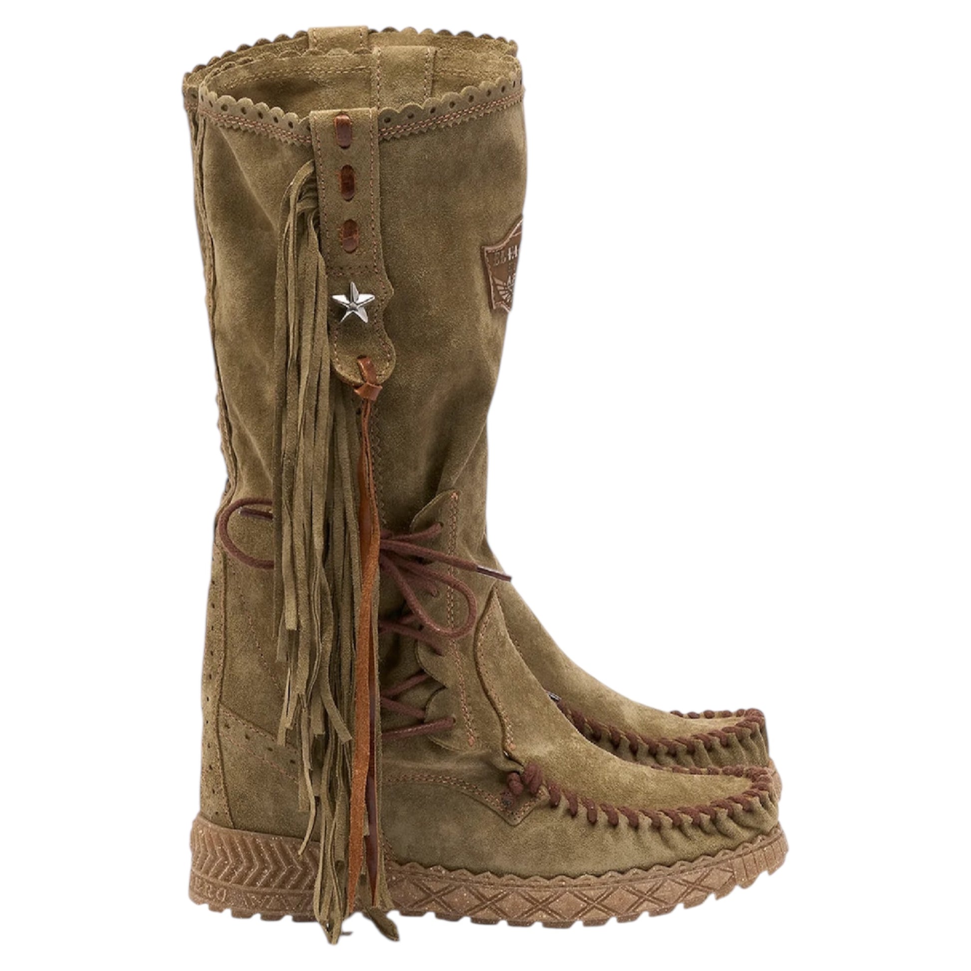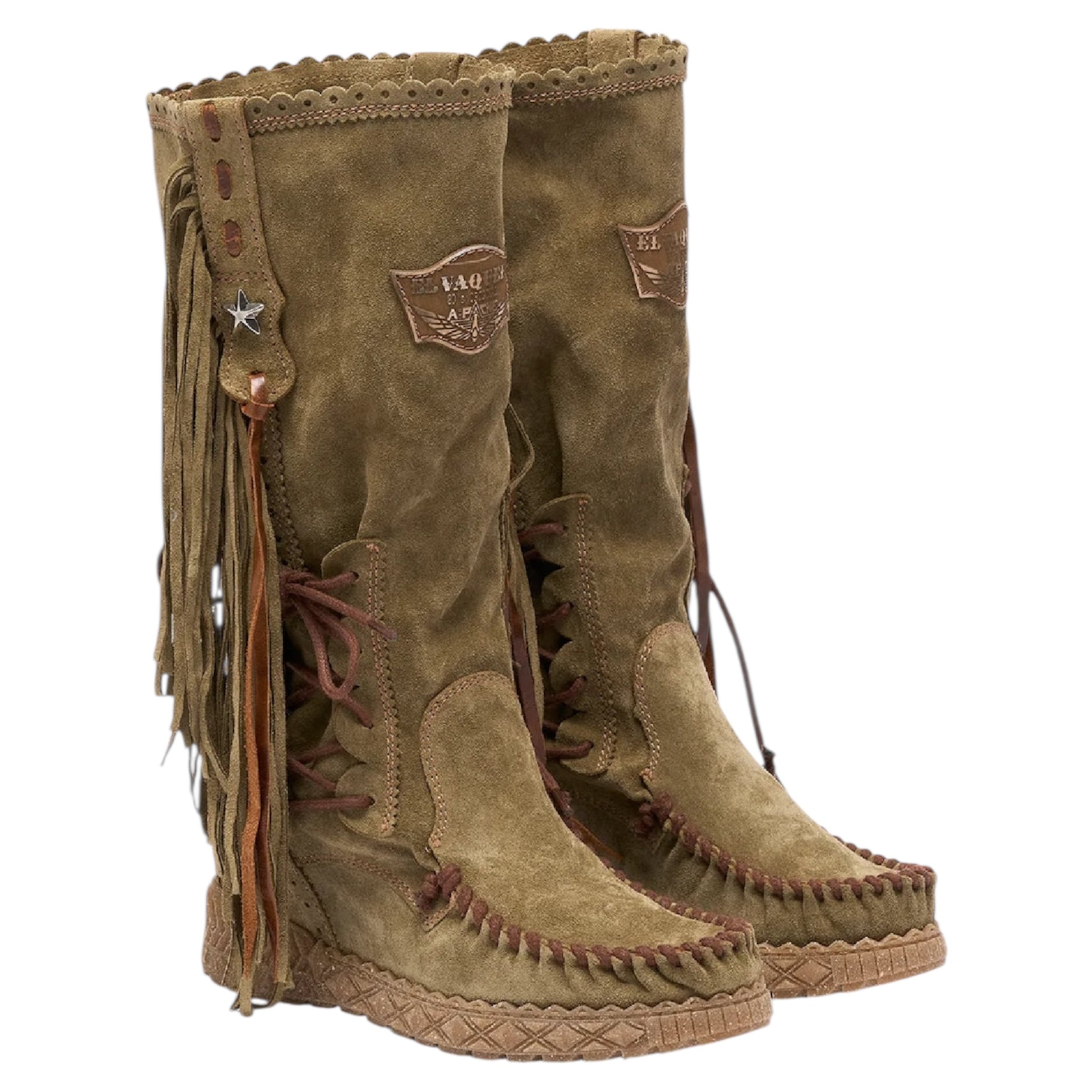 Lo stivale a metà gamba Billie è caratterizzato da zeppa interna di 7 cm, morbide frange, bellissimi ditteagli in pelle laterali e spesse cuciture fatte a mano sulla vaschetta, segno distintivo del marchio El Vaquero. Rifinito con il celebre lavaggio Silverstone, pietra miliare del marchio El Vaquero, che esalta ogni sfumatura della pelle nei suoi colori più intensi e rende ogni stivale diverso e unico nel suo genere.