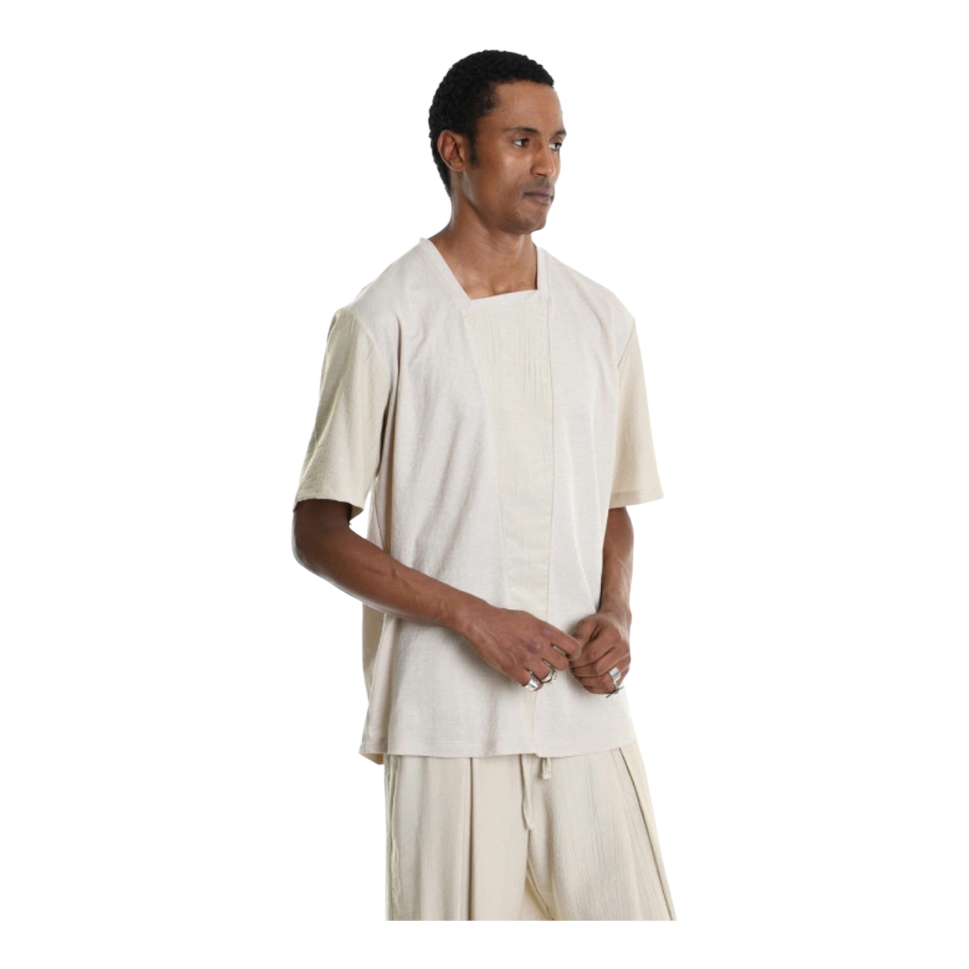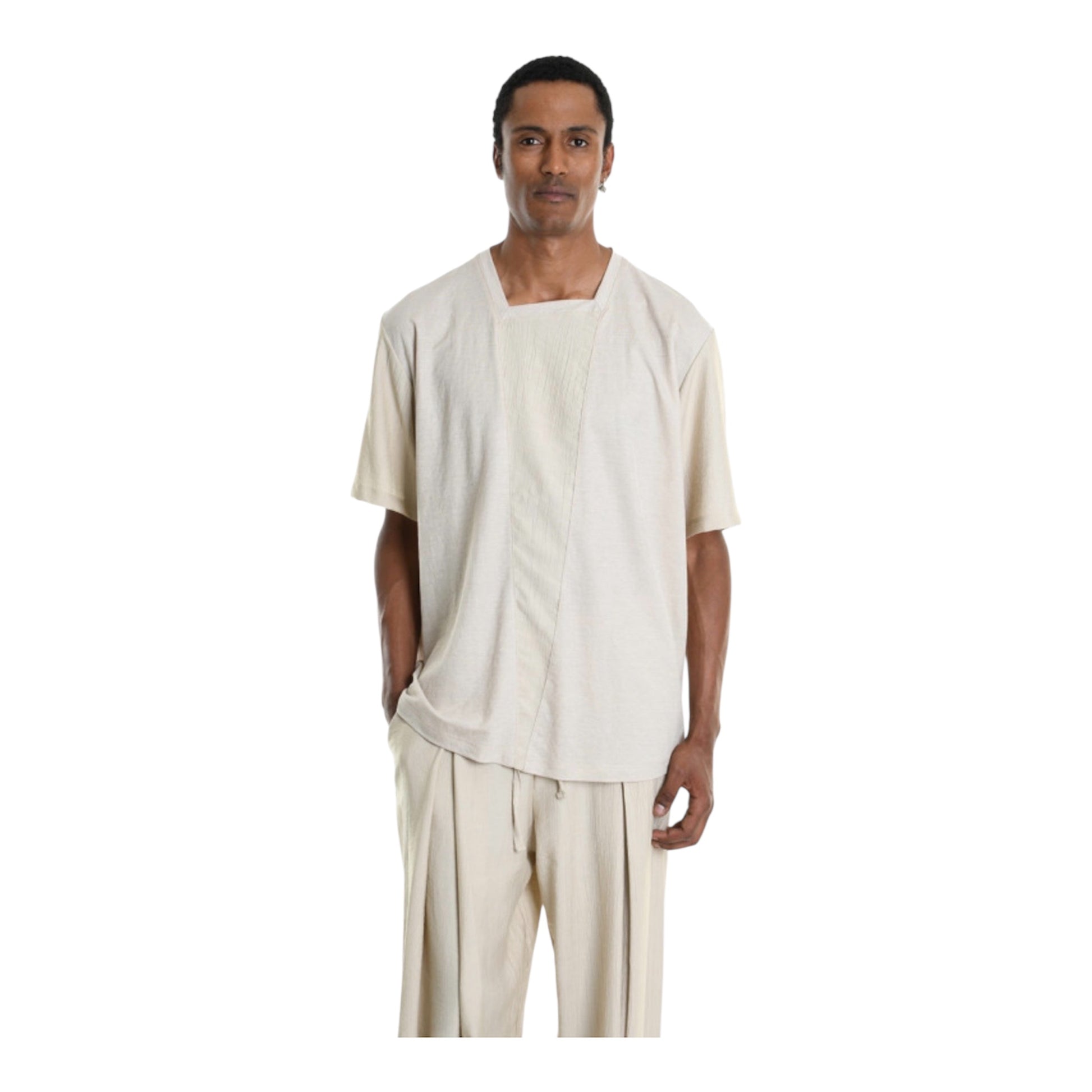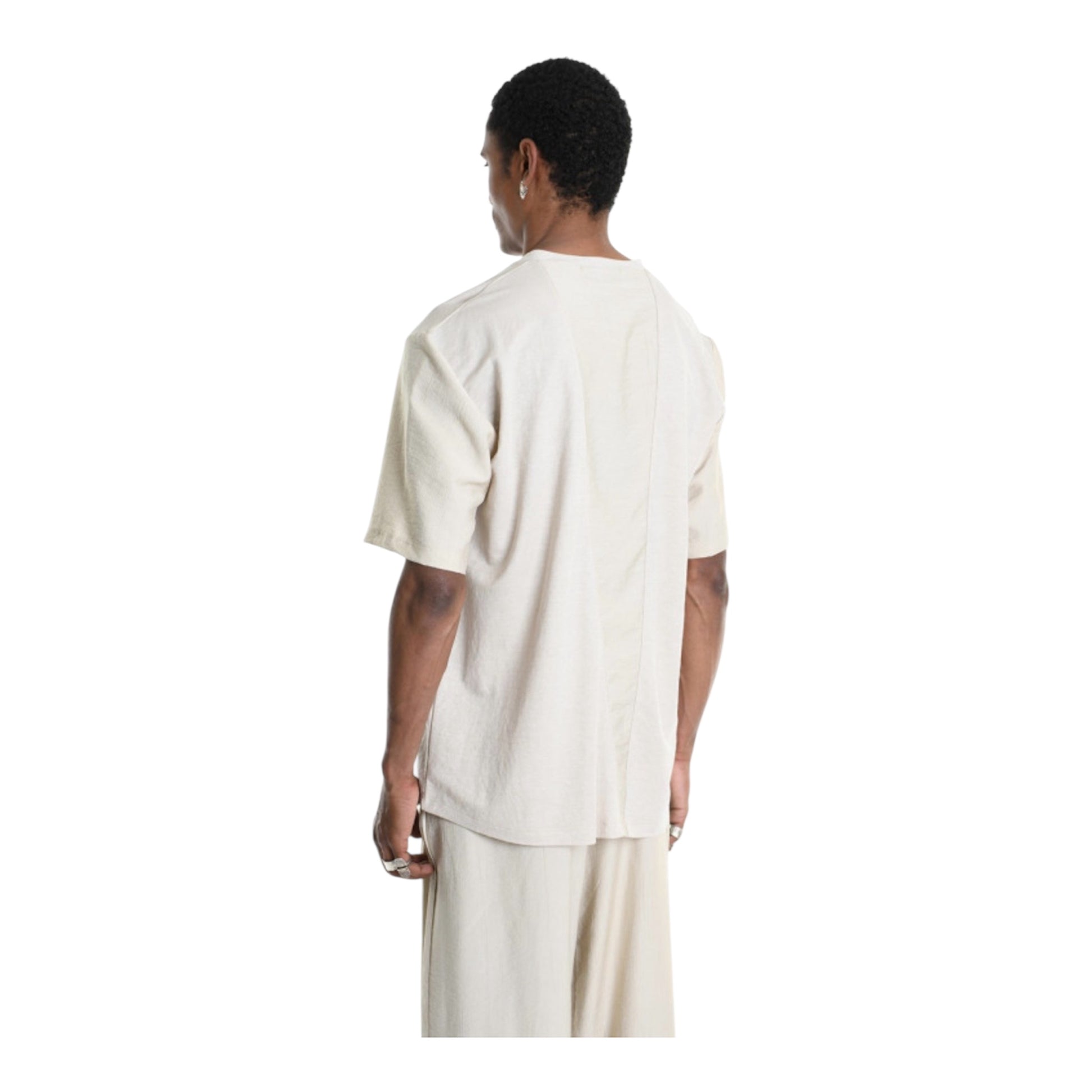 T-shirt over asimmetrica in viscosa nylon con inserto in viscosa goffrata - Scollo squadrato asimmetrico